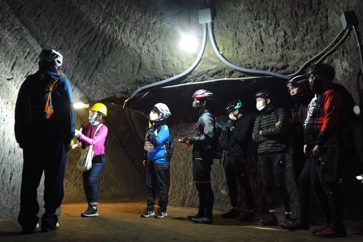 赤山地下壕。ヘルメットを装着したまま、暗い壕の先へ。過去の戦争の歴史も学べる