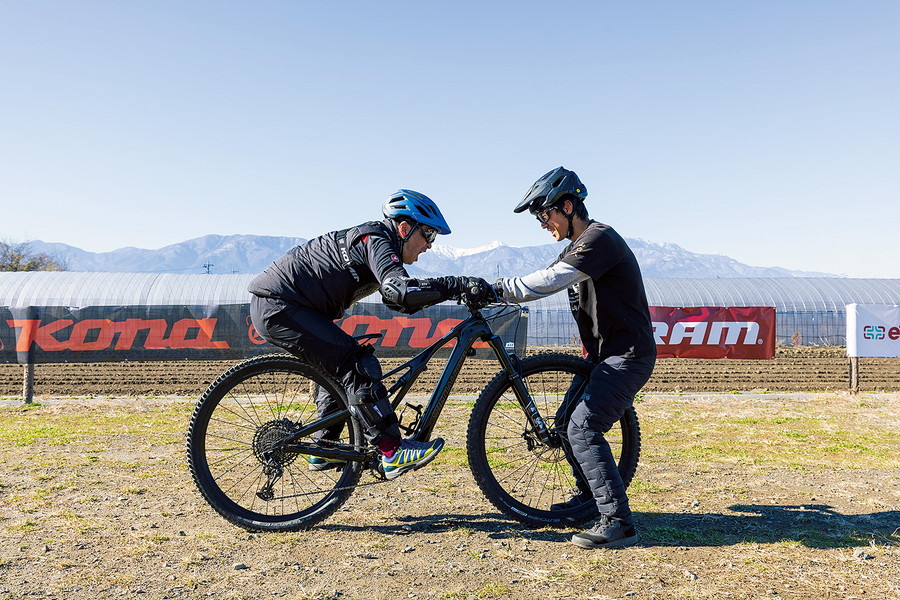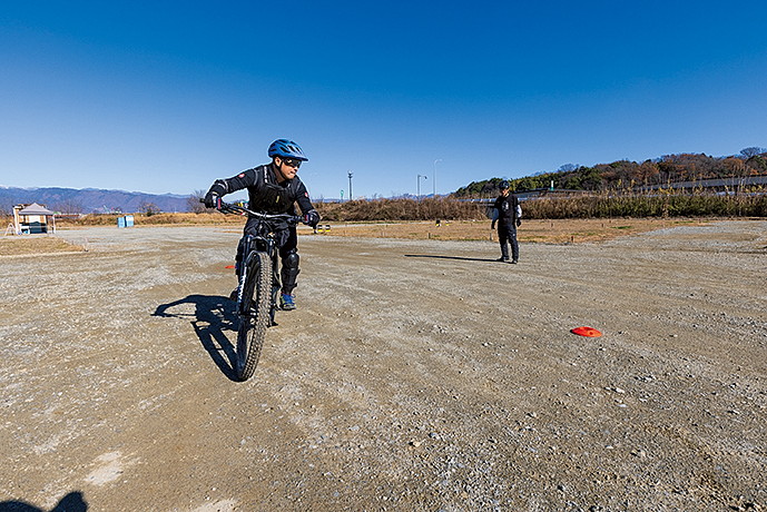 MTBの経験はあったものの、基本を教わらず走っていたという団長さん。ここではMTBに乗るうえでの基本姿勢から曲がり方や止まり方を基礎から教えてくれる。MTBに乗るのが初めてでも安心して走り出せるのだ。