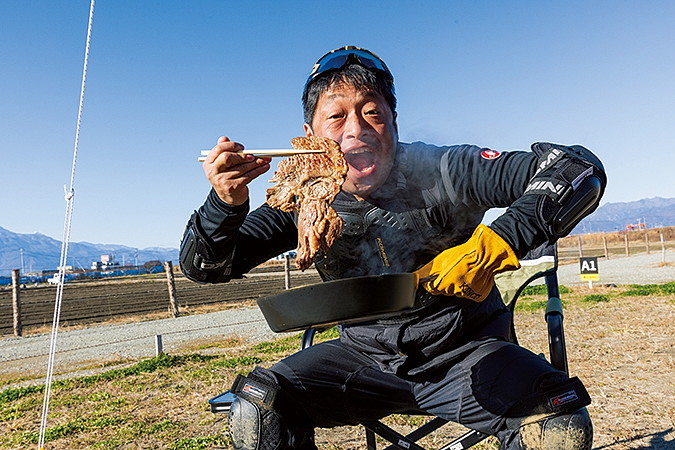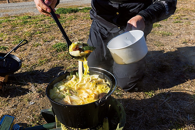 広大なスペースにはAC電源付きのキャンプサイトも設置される。日帰りでもタープやたき火台、バーナーなどをレンタルすれば、バーベキューも楽しめる。食材は持ち込みなので、団長さんは山梨名物のほうとうをチョイス。