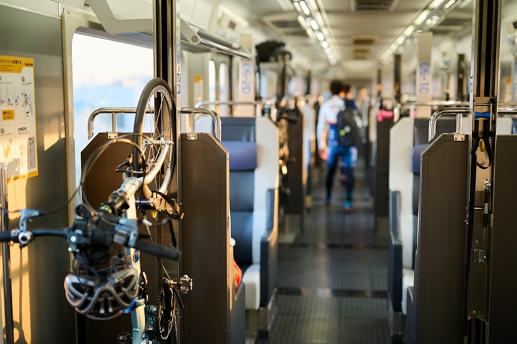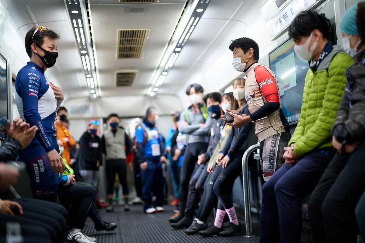 2022年3月5日、東京両国駅に集まった(一部コースの)サイクリストが続々とサイクルトレインB.B.BASEに乗り込んでいく。車両に自転車をそのまま持ち込み専用スタンドにセットしたら、あとはゆったりと千葉県館山駅への到着を待つのみ。