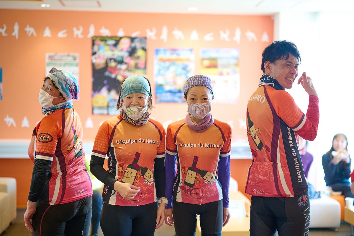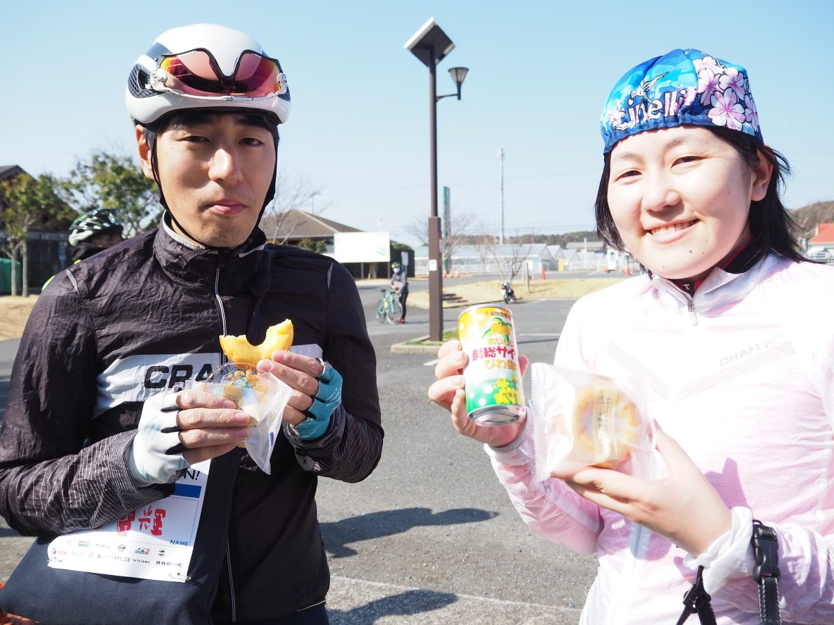 海岸線を離れ内陸部へのコースへ変更。風をなんとかやり過ごしたライダーたちがゴール地点のファミリーオ館山へとたどり着く。自転車を停めて完走の手続きをし、手渡されたコーヒーとお菓子を口にする。するとあちこちで口々に「いやーすごい風だったね!」と話しながらもう笑顔になっているのだから、やっぱりサイクリストはタフだ!