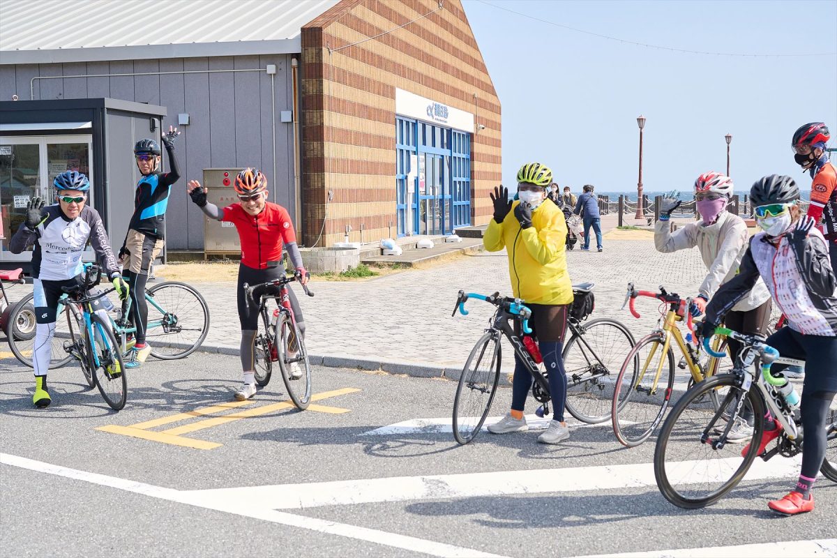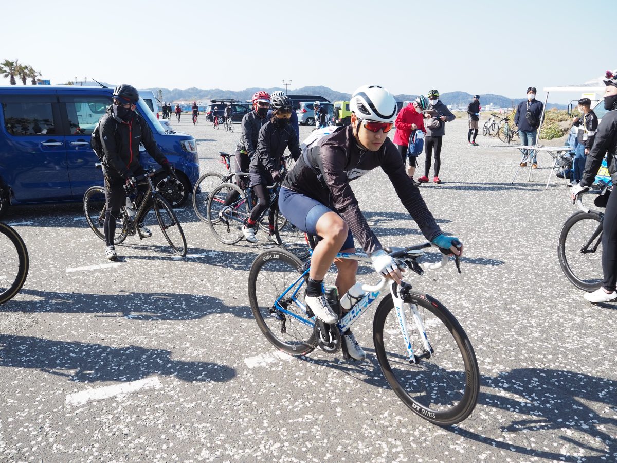 50、80、100、120kmのスタンダードコース、アドベンチャーコース(40km)の参加者でにぎわう北条海岸で、自身のグループを見つけたらいよいよスタート。グループ人数はまちまちだが、5~8人くらいにまとまることが多い。