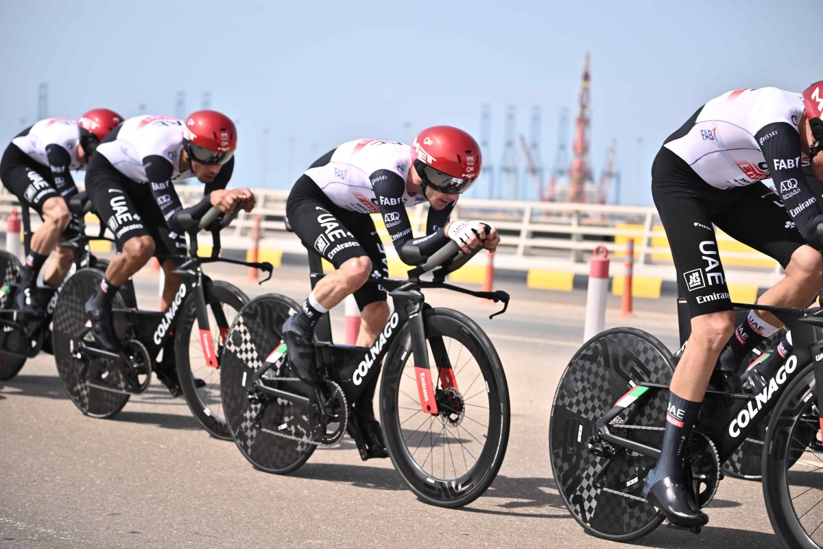 前日行われた第1ステージの結果から、チーム総合の最下位から順にコースへと繰り出す。一番手はホームチームであるUAEチームエミレーツ。大会初日は思わぬ苦戦を強いられたが、ここから巻き返しを狙う。その姿勢は走りにも表れ、ハイスピードで進行。途中で数人を切り離しながらフィニッシュへとやってくると、タイムは18分33秒。これが各チームのターゲットとなった。