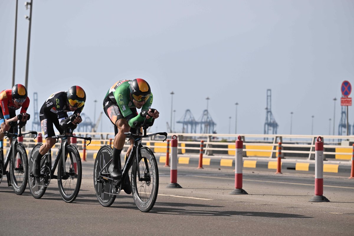 UAEツアーでチームTTが採用されるのは、第1回大会の2019年以来。今回はカリファ港内のコンテナターミナルにコースを設定。オールフラットで、途中2カ所の鋭角コーナーと、同じく2カ所のヘアピンコーナーをいかにしてクリアするかがポイント。道幅は広く、各チームの走りを左右する風は西から吹き、選手たちにとってはおおむね横から受ける格好となった。