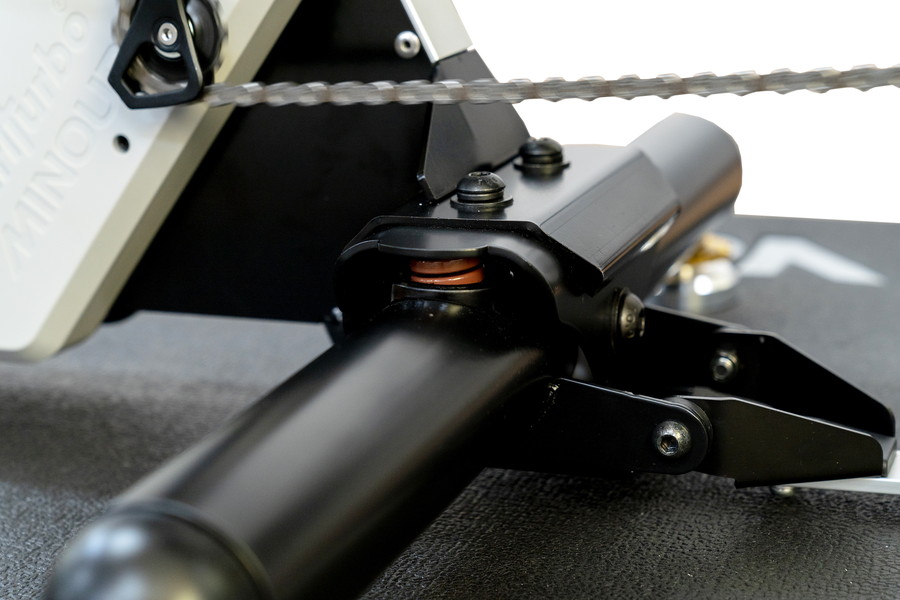 前輪と後輪を取り外し、浮かせた状態(フローティング)にセッティング。本体を支える脚部分にカセットスプリングを搭載し、左右に最大5.6 度(合計11.2度)の可動域を設けることでリアルな実走感を実現した。