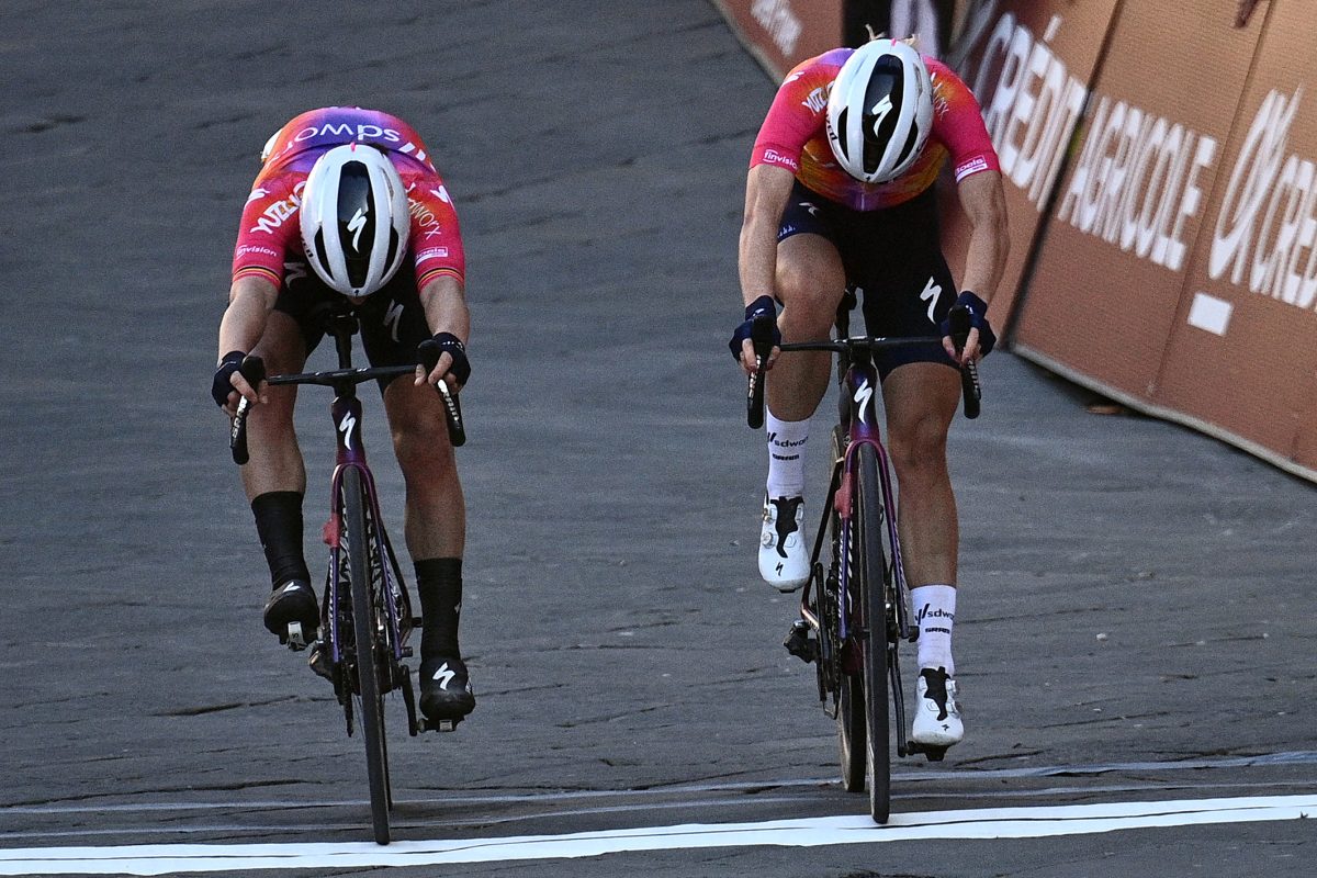 こうした流れから、フィニッシュまで51kmを残したタイミングで新たな局面がやってきた。アルベルト・ベッティオル(EFエデュケーション・イージーポスト、イタリア)が集団から抜け出すと、すかさずアンドレア・バジオーリ(スーダル・クイックステップ、イタリア)がチェック。さらにピドコックが追いかけて合流すると、そのまま追走パックに。さらに、8番目の未舗装セクター、上り勾配10.3%のモンテ・サンテ・マリエでピドコックがスピードを上げると、ベッティオルとバジオーリはついていけず。ピドコックは単独での追走に移る。