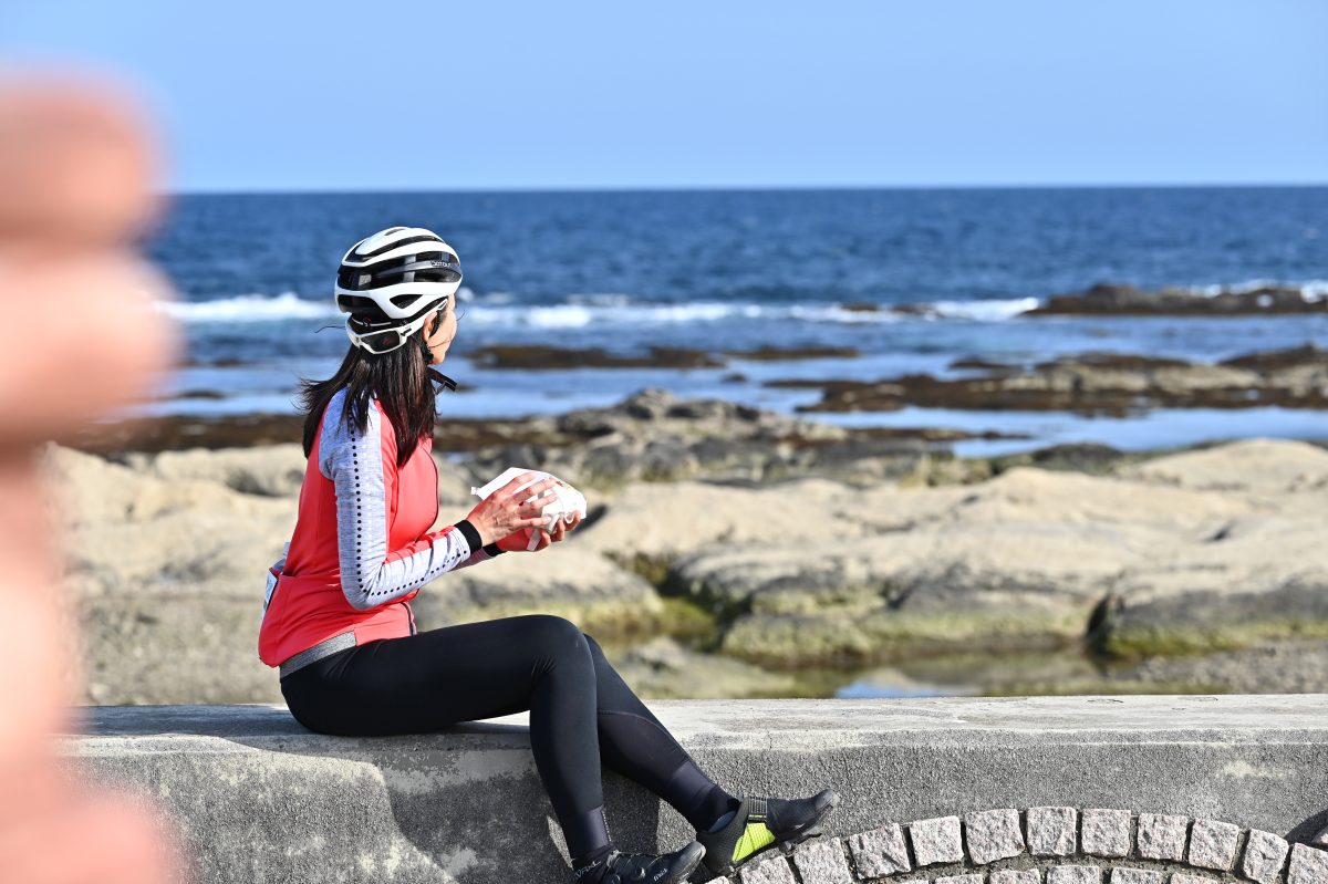 参加数名ずつ集団をつくり、ガイドライダーを中心に走っていく。120kmコースの約86km地点でエイドポイントでもある「道の駅 ちくら潮風王国」へ。ここではひじきコロッケバーガーを堪能しラストスパートの準備だ。再び集団は追い風に乗って房総半島最南端の野島埼へ。ここの広場が道中の最終エイドポイントになっている。