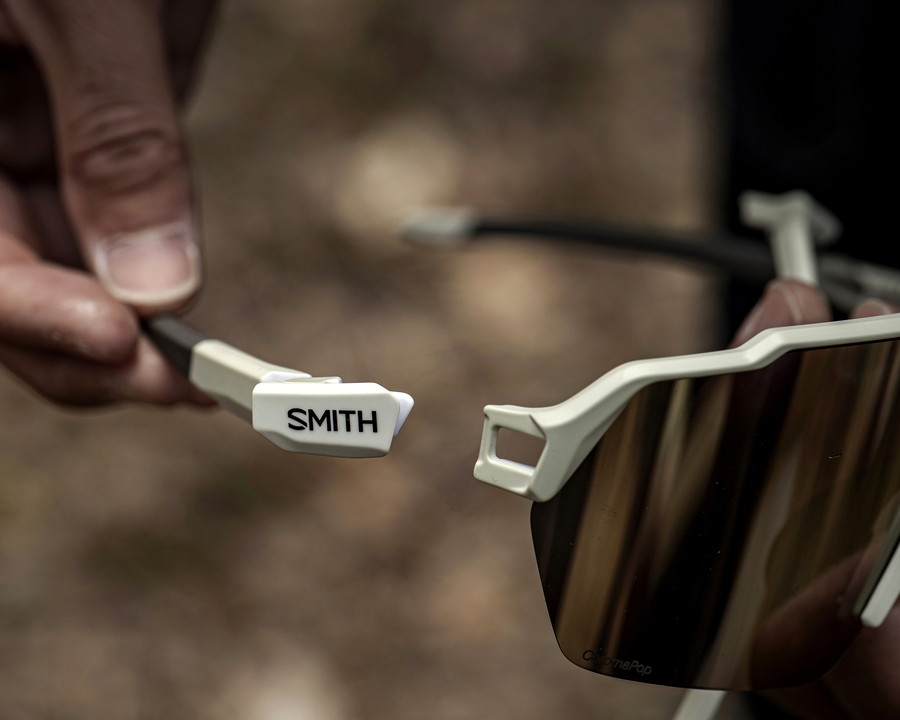 Smithらしいスタイリングのニューモデル。大ぶりレンズは日本人の顔にマッチすると昨今のトレンドを喜んでいるが、このモデルもまさにそう。レンズが大きいアイウェアはフルリムにすると重量がかさんでしまうが、Shift Split MAG™はハーフリムにすることでそれをうまく解消している。レンズ上部にはスリットが入り通気性を確保しているのと、この上部のフレームが一段頭頂方向に高くなっていて、ヘルメットとの間に生じるマユ毛スペースを埋めてくれる。乗れているサイクリストにオデコの出ている者はいない。小さいスペースだが、ここにこそライダーのスタイリングの神は宿る。