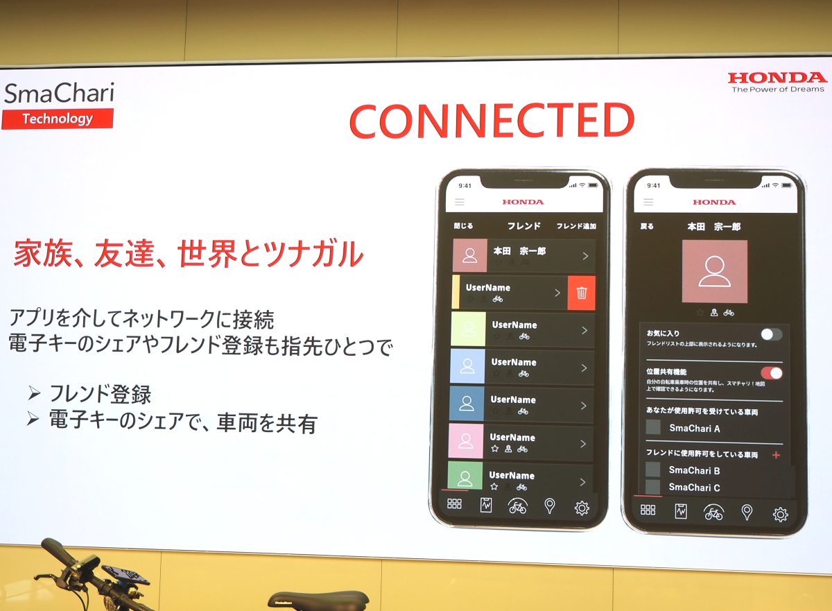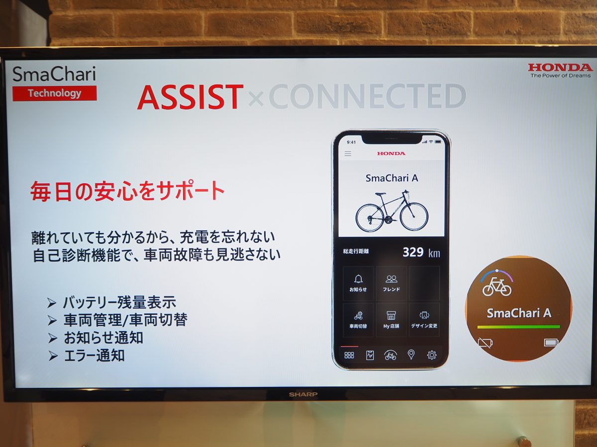 SmaChariとは、Hondaの新事業創出プログラム「IGNITION」より考案され、構想から4年をかけて開発された全く新しい電動アシスト自転車システム。後付け電動アシストユニットとそれに連動するアプリにより、既製の自転車を電動化し、新たな電動アシスト自転車モデルとするものだ。アプリ(ストアからダウンロード)利用には会員登録が必要だが、利用料金は無料を予定している。