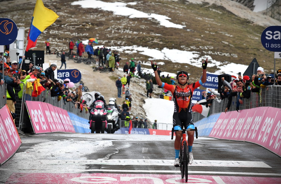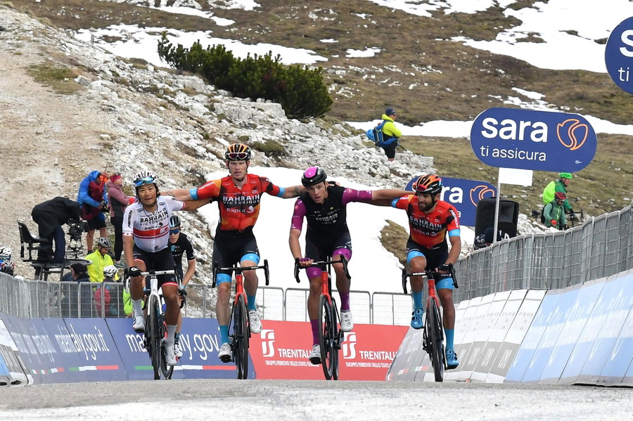 第19ステージはドロミテ山脈の中を縫うように中盤の2級から始まり、下ってはまた次の1級山岳、続けて1級、2級、フィニッシュは1級山頂と5つの山岳を越える難易度5つ星の183km山岳ステージ。今大会最後の過酷な山岳ステージで、逃げに成功したバーレーン・ヴィクトリアスのサンティアゴ・ブイトラゴ(コロンビア)が登坂力を生かし、見事優勝を飾った。