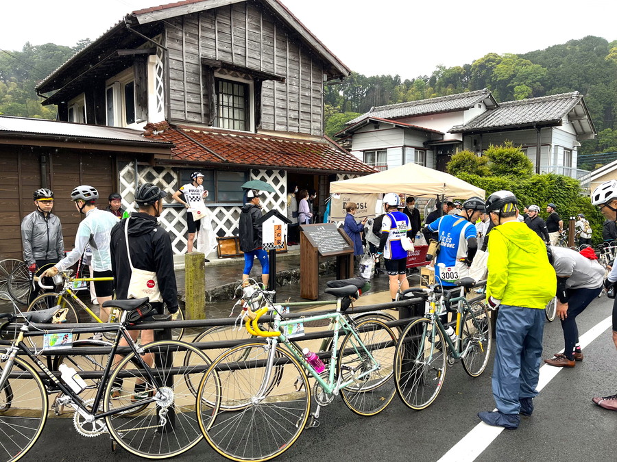 最初のエイドステーションに到着するころには、雨も小降りに。各エイドの補給食はバナナや地元の和菓子、もなかやまんじゅうなど。適度な量でライドの補給にぴったり。