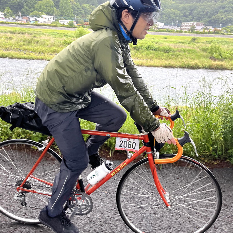 スタート前は、曇天。薄く日も差す瞬間もあって、ひょっとしたらこのまま濡れずにいけるかもという淡い期待も。ワサビ70は、なごやかにスタートした。っと走りだしたら数10秒後に土砂降り。30秒前に降ってきてくれれば、レインウェア万全で走りだせたのに。結局、シートバッグに入れたレインウェア上下を出してスタート早々に着ることになったけど、すでにびしょ濡れ。