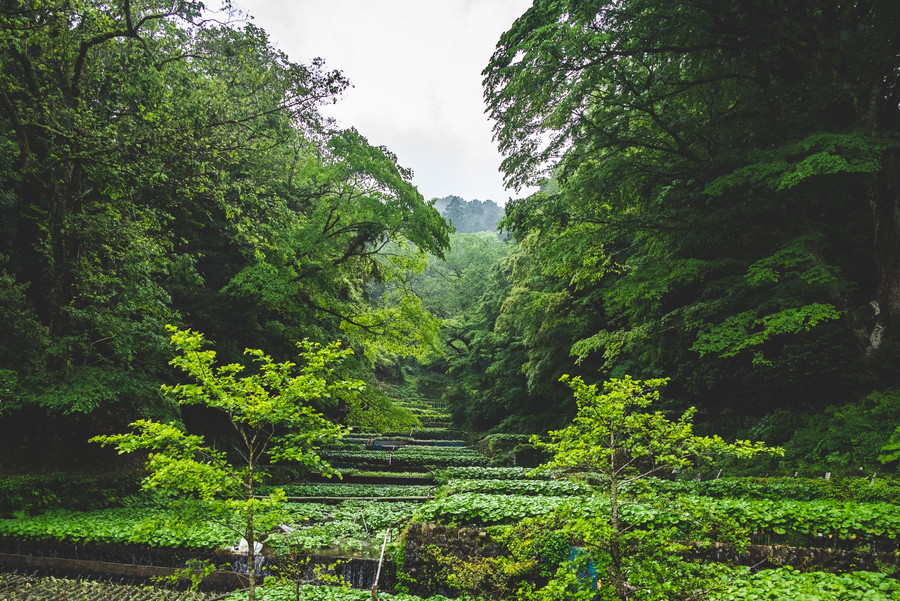 ライド前半の峠道は、ワサビコースのがんばりどころ。国士峠に至る伊東西伊豆線は、木々に囲まれた静かな道でまたツーリングに来たいと思わせる。上りきって、古いブレーキをキーキーいわせて下るとワサビ田。しっとりとした伊豆の恵みだ。