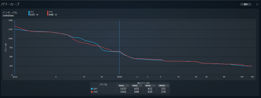 グラフはこれまでアップロードしたすべてのデータからベストのMMPを集めて表示するだけでなく、任意の期間を区切ってその期間同士のパワーカーブを比べることも可能だ。