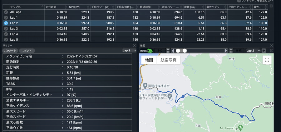 個別のワークアウトの詳細画面で、任意のラップや時系列グラフのウインドウ上で任意の区間をドラッグで選択すると、地図上にそのラップや区間が色分けされて表示される。この機能を活用すれば、上り区間での走りや周回レースの特定ポイントでの走りを細かくチェックできる。この機能は福田さんもよく使っているという。