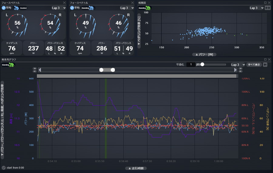 「パワーバランスとトルクの相関に注目すると、中盤の左右のパワーバランスが50:50に近いところで推移しているときはトルクが高い傾向にあり、右のパワーが強くなるタイミングでトルクが低くなる傾向にあることがわかります。つまり、フォームが崩れてトルクが出せなくなっていると考えられます。ただ、平坦でパワーやトルクを安定させるのは上り以上に難しいので、そのことが影響している可能性もあります」