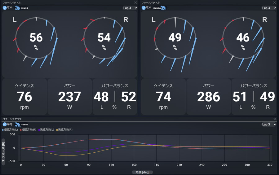 フォースベクトルを活用することで、上死点(クランクが12時の位置)から踏み遅れることなくクランクを倒すような力のかけ方ができているかや、下死点で真下に踏み抜いたりクランクの位置が6時以降の引き脚局面で無駄な力がかかっていないかが確認できる。