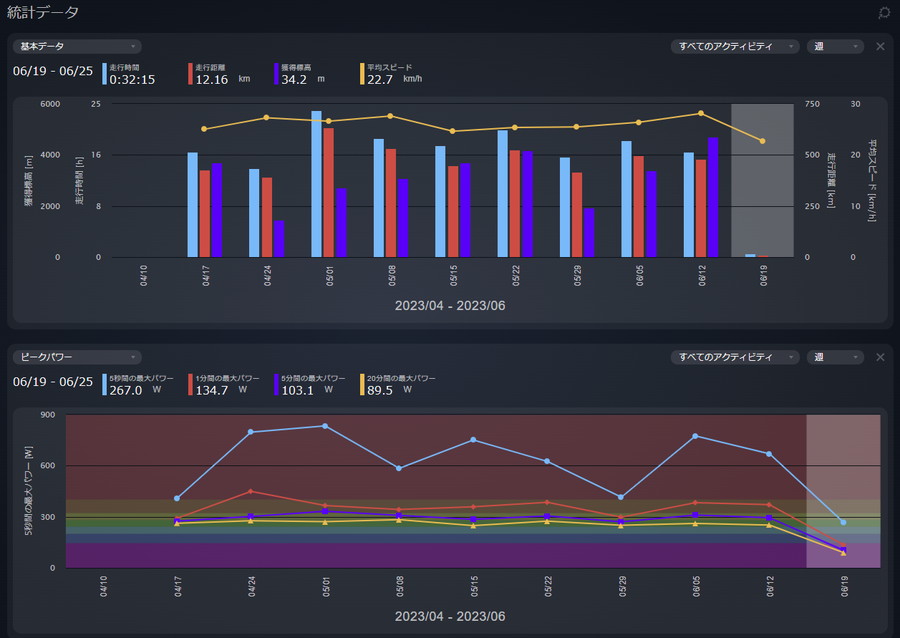 表示するデータは、統計データのウインドウ左上の「基本データ」で切り替え可。走行距離や走行時間などがわかるほか、パワートレーニングでのパフォーマンス変化を見られるピークパワー、Di2の変速回数といったマニアックな統計も知ることができる。