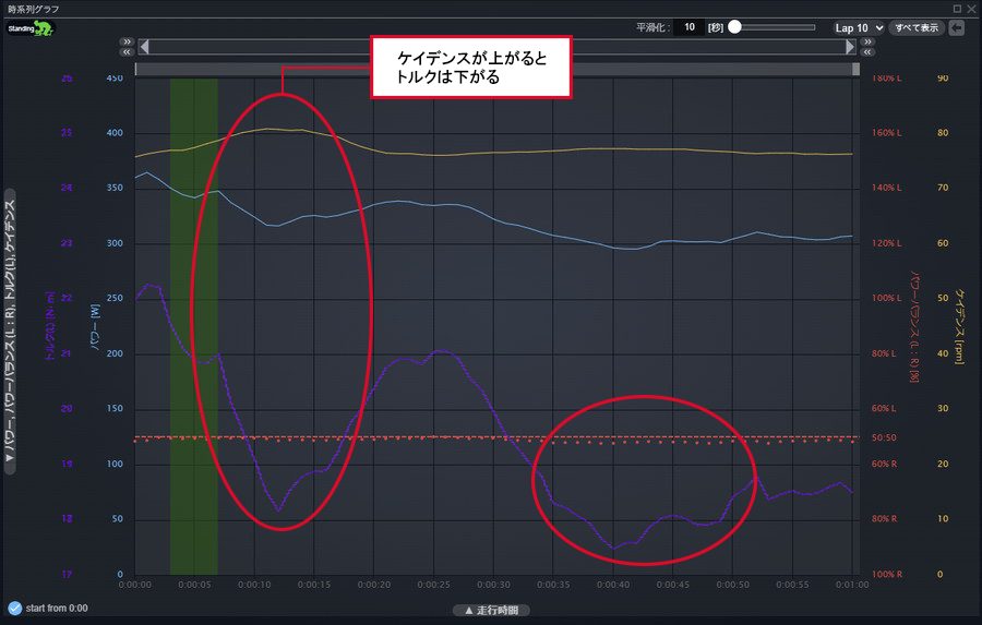 「SFRでもトルクがしっかりかけられているときはパワーバランスもいい傾向にありますね。何本かリピートしていますが、だんだんトルクが出せなくなってケイデンスも上がってしまっているのがわかります。同じパワーで走っているとき、ケイデンスが上がるとトルクは下がるので、SFRの目的であるトルクをしっかりかけることができていないことになります」