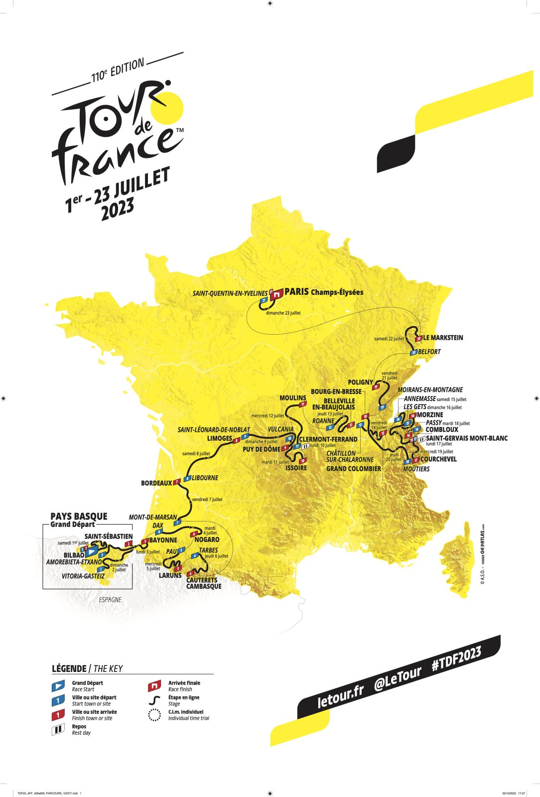 2023年大会のグランデパール(開幕地)は、スペインはバスク自治州のビルバオ。フランス国外での開幕は2年連続25回目で、スペインでは1992年のサン・セバスティアン開幕以来となる31年ぶり2回目。6月29日にグッゲンハイム美術館で行われるチームプレゼンテーションで顔見せした選手たちが、いよいよ3週間の長旅へ一歩を踏み出す。サッカー・リーガエスパニョーラの名門、アスレティック・ビルバオのホームスタジアムである「エスタディオ・サン・マメス」をスタートし、ビスケー湾沿いやバスクの象徴であるゲルニカを通過。2級から4級まで5つのカテゴリー山岳が設けられるコースは、主催者いわく「史上最難関の第1ステージ」。フィニッシュ前約40kmからの4級コル・ド・モルガ(登坂距離4km、平均勾配4.1%)、2級コート・ド・ビベロ(4.2km、7.3%)、3級コート・ド・ピケ(2km、10%、最大勾配15.6%)が集団をふるいにかける。ピケの頂上には8秒・5秒・2秒のボーナスタイムがあり、そこからはビルバオ市街地へのダウンヒル。大会初日から獲得標高3300m、先々のマイヨ・ジョーヌ争いにも影響を与えかねない1日である。