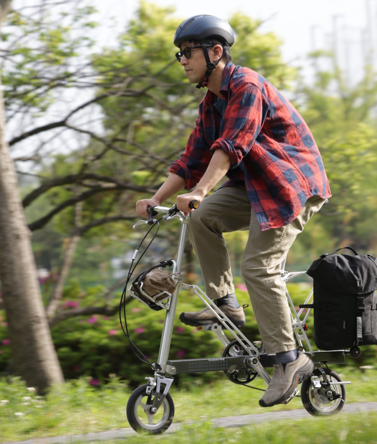 バーディーは小さく折りたためるにも関わらず、スポーティーな走りも楽しめる自転車。革新的な折りたたみ手法で、フレーム剛性を確保することに成功。モデルは、20年以上のアップデートを続けて完成の極みに達している。バーディー・クラシックEVOは今年発表されたニューモデルで、第2世代のクラシカルなパイプフレームに、グラベルバイクの要素を追加している。価格31万3500円。コンパクトにたためて、スポーティーにどこへでも走っていける究極のスポーツバイクといえる。シンゴさんもその俊敏な走りとフォールディング機構に感動!