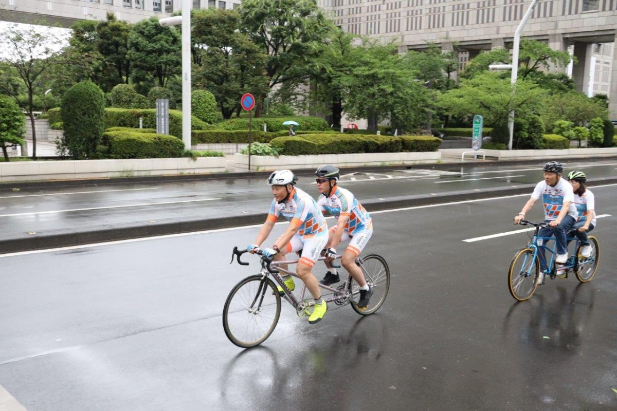 さらにセレモニーのあとは10数台のタンデム自転車によるデモ走行が行われた。都庁前の道路を走り抜け、奇跡的に雨が弱まったタイミングで東京都内で初日となったタンデム自転車の公道走行を楽しんだ。