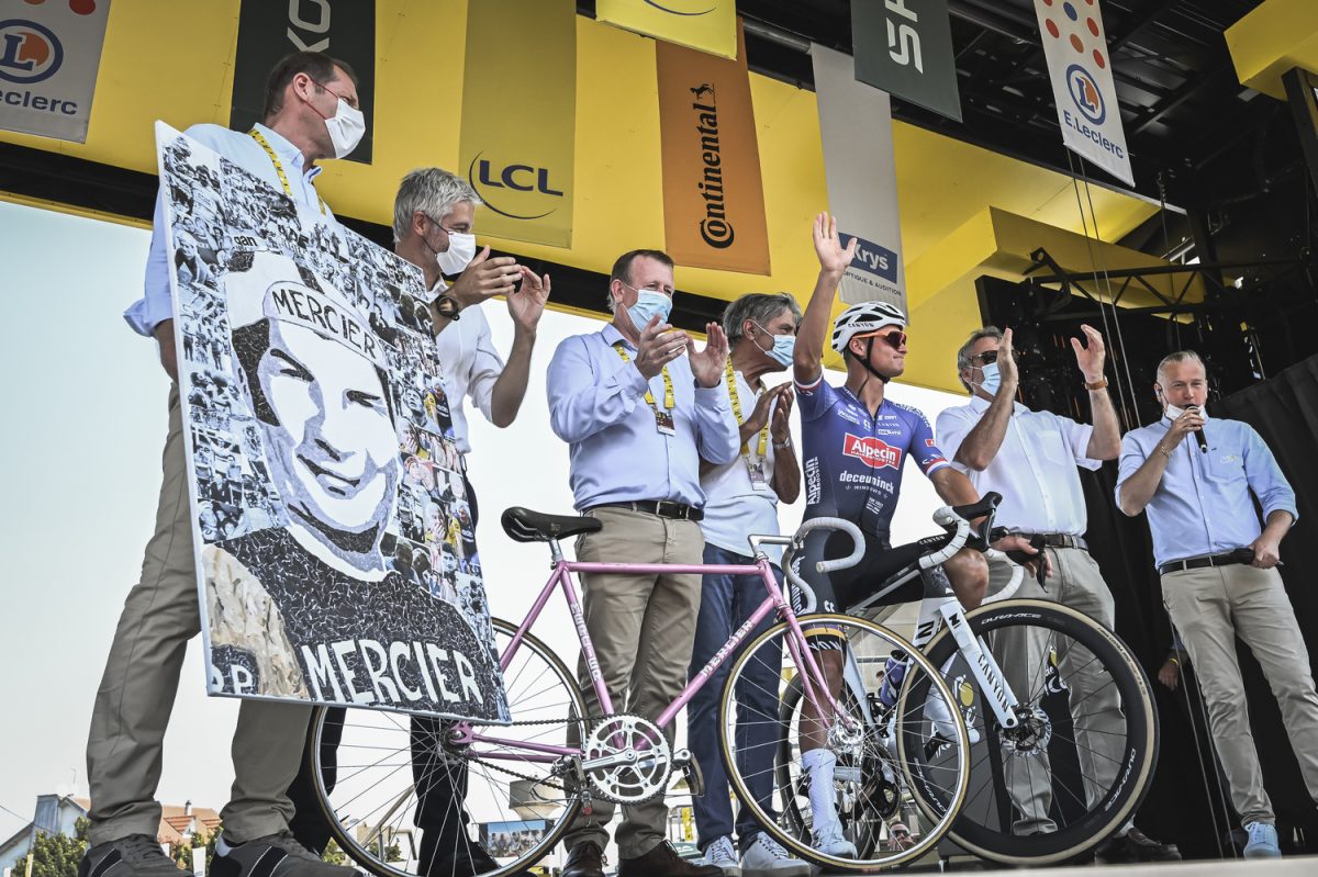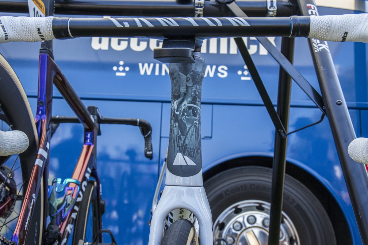 スタート地サン・レオナール・ド・ノブラは、名選手レイモン・プリドールが晩年を過ごした街。孫にあたるマチュー・ファンデルプール(アルペシン・ドゥクーニンク)はこの日、祖父から自身まで3代にわたる系譜をたどることのできるスペシャルペイントのバイクで出走した。