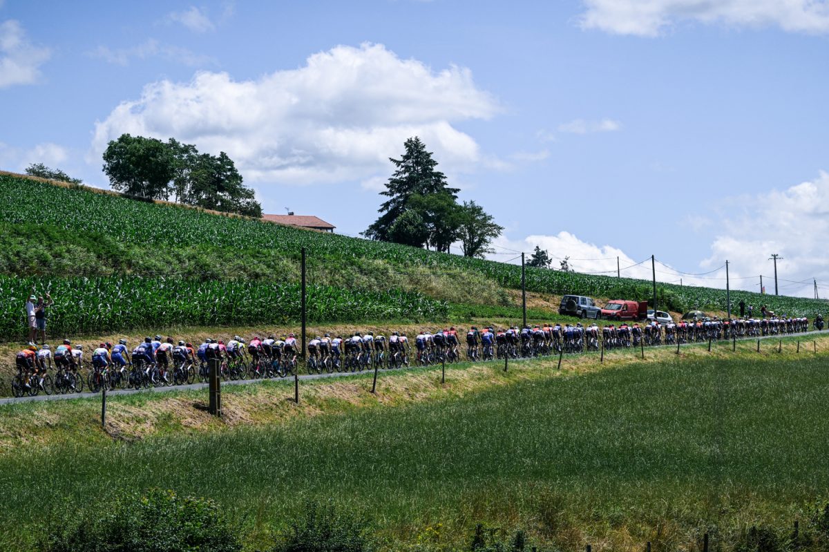 マッズ・ピーダスン(リドル・トレック、デンマーク)のスタートアタックでレースが始まると、ここから長くアタックとキャッチが繰り返される。この日最初のカテゴリー山岳である3級の上りでペテル・サガン(トタルエナジーズ、スロバキア)やカレブ・ユアン(ロット・デスティニー、オーストラリア)らが遅れたほか、25kmに差し掛かろうかというタイミングでは集団が割れて前線には40人程度しか残らない状況に。クラッシュも起こり、ダビ・デラクルス(アスタナ・カザクスタン チーム、スペイン)とカンタン・パシェ(グルパマ・エフデジ、フランス)が地面に激しく打ち付けられてしまう。デラクルスはすぐに起き上がることができず、そのままリタイアとなっている。