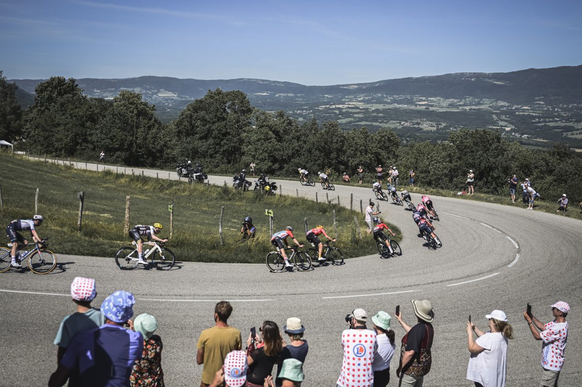 フランスの7月14日は革命記念日。例年ツールでは疑う余地のないコースが用意されるが、今年も例に漏れず重要な1日をもたらした。137.8kmとレース距離としては短いが、平坦区間を長く走り、無印の上りをこなしたら目の前には名峰グラン・コロンビエがそびえる。登坂距離17.4km、平均勾配7.1%で、断続的に緩急の変化のある上り。中腹前後で最大勾配12%を迎え、少しばかりフラットな区間を走ったら、最後の3.4kmで再度急坂へ。10%超の最終局面をこなしてフィニッシュラインに到達する。フィニッシュ地になるのは2回目と少ないが、過去にツールでは5回上って、一番に登頂した選手がその年の山岳賞に輝いているというジンクスも。初の山頂フィニッシュだった2020年大会では、ポガチャルが勝利を挙げている。