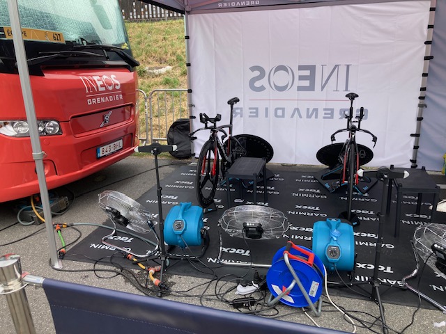 イネオス・グレナディアーズのチームパドック。あらゆるアイテムを用いて暑熱対策を行っている Photo: Kenichiro MORIKAWA