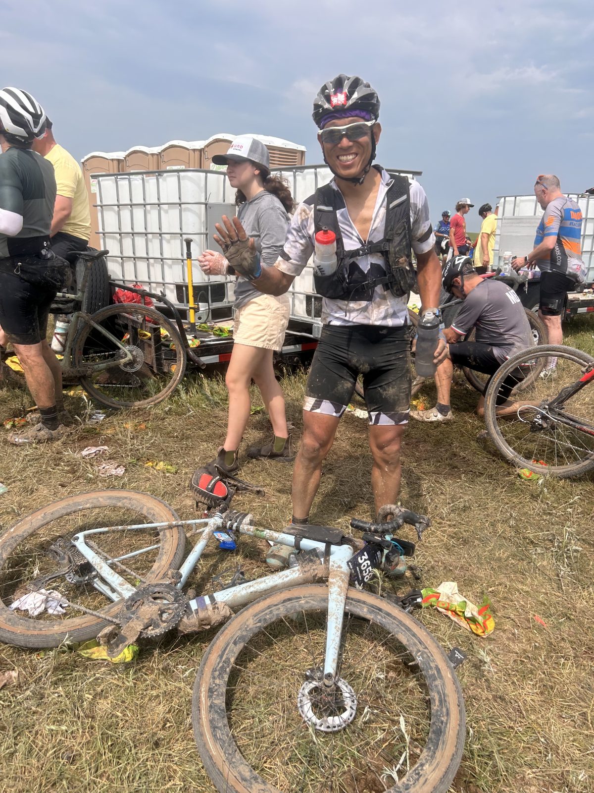 気力だけで10kmを押したり担いだりしながらも泥区間をパス。ある程度泥を手ではぎ取り久しぶりの乗車。まだまだ泥で変速がイマイチだがホイールが回るだけで御の字だ。程なく道中の水たまりを利用して車体の泥を落としている参加者の集団を横切った。