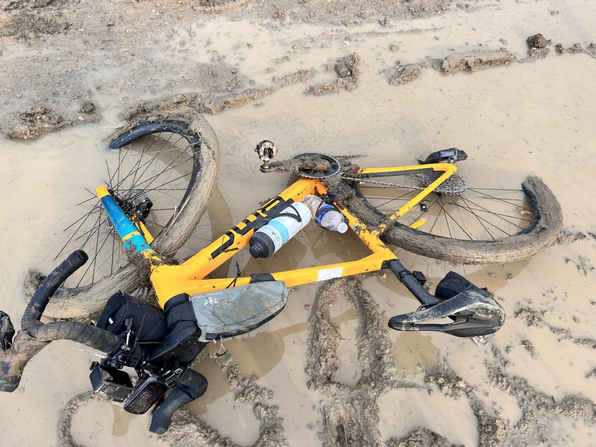 「順調に最初はこなせたかな……このまま可能な限り問題なく過ごせれば……」などと甘い考えをもったがその希望はすぐに消えた。前方で急に失速し、前が詰まって立ち止まっている人多数。何事かと思うや否や、足元にすごい泥。そうはいっても泥くらいなら進むでしょ、と侮ることなかれ。米国の泥はレベルが違った。タイヤにまとわりつき、落ちない。自転車を押して進むも泥の上にさらに泥がつき、フレームとのクリアランスを一瞬で埋めてしまう。結果としてタイヤがロックし転がらない。