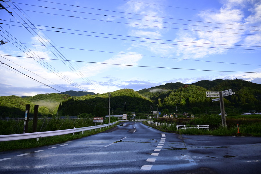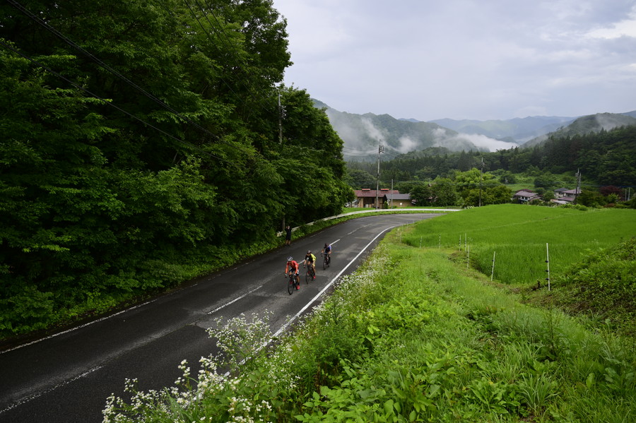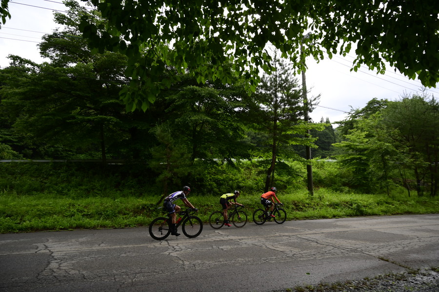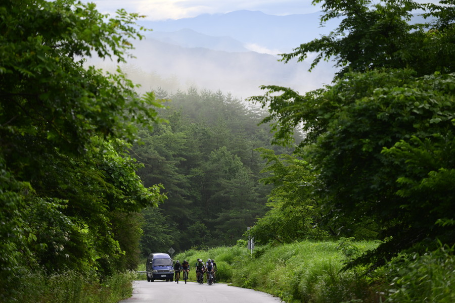 10時ごろになると日差しが照りつけかなりの暑さとなった。この日の天候は雨から晴れに、そしてまた雨、曇りなどと変わりゆき、梅雨の山岳地帯らしい安定しない空模様となった。日陰のない路面上ではグングンと気温も上がり、「暑くてボーっとしてきちゃう」と篠さんは何度も頭から水をかぶっていた。