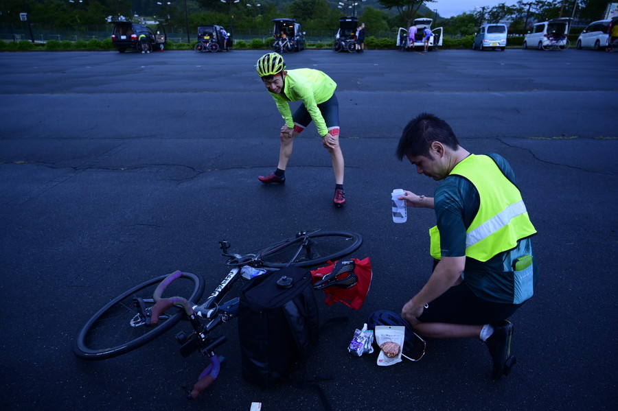 夜明け前の4時半、まだ暗いうちから出走の準備をする参加者たち。2日目は残念ながら群馬グリフィン・レーシングチームの金子宗平選手はDNS。元々痛めていた肋骨のケガと、昨日のロングライドで股擦れが起きてしまったとのこと。渡辺将大監督と共に、チームサポートカーで同行してもらう運びとなった。