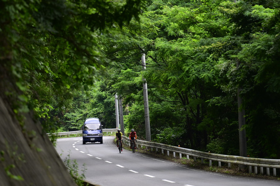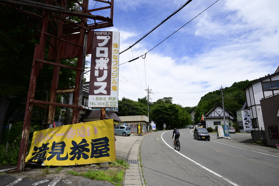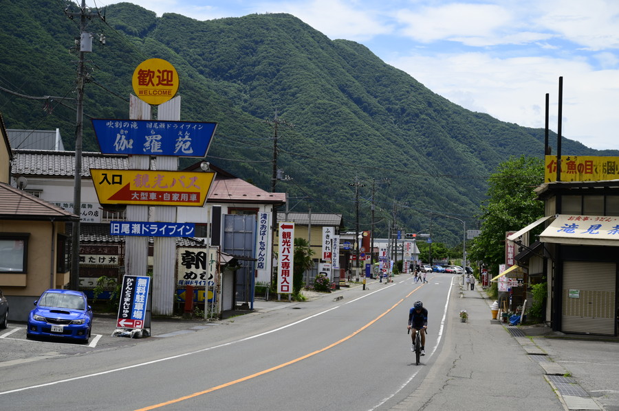 雄大な山々を背景に望郷ラインを走り続ける。時には集団で、時にはソロで、それぞれが持てる体力を振り絞り、踏み進んで行く。昨日は下った国道120号、両脇に巨大看板が立ちならぶ吹割の滝の前も、脇目も振らずに渾身の力で上る!