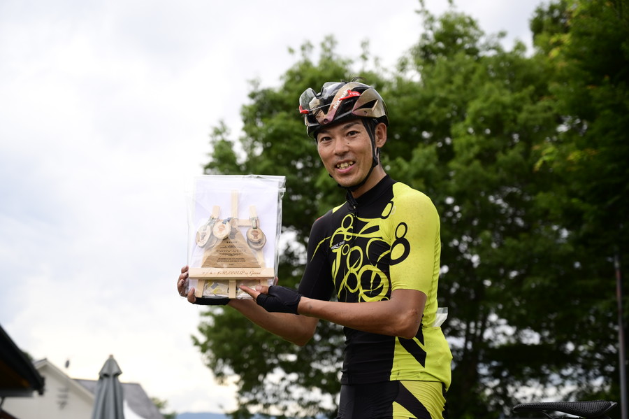 達成者には木製メダル「走破の証」の各コース分5枚が、利根沼田サイクルツーリズム推進委員会会長・小野里隆行さんより手渡された。