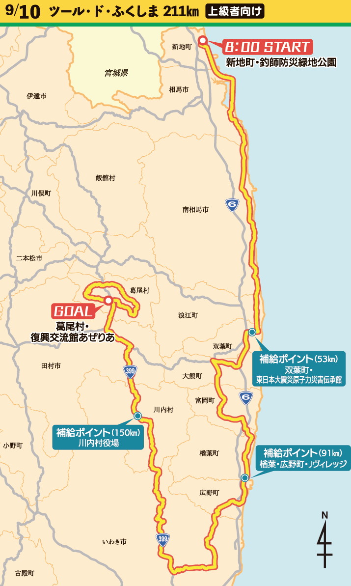 9月9、10日に福島県浜通りエリアで日本最長となる211kmの公道市民レース「ツール・ド・ふくしま」が開催される。コースは一部国道6号を使うなどぜいたくなコース取り。それも太平洋岸沿いを北から南へ下り、最後は厳しい山岳コースで知られる葛尾村へ至るという国内では前代未聞のラインレースだ。