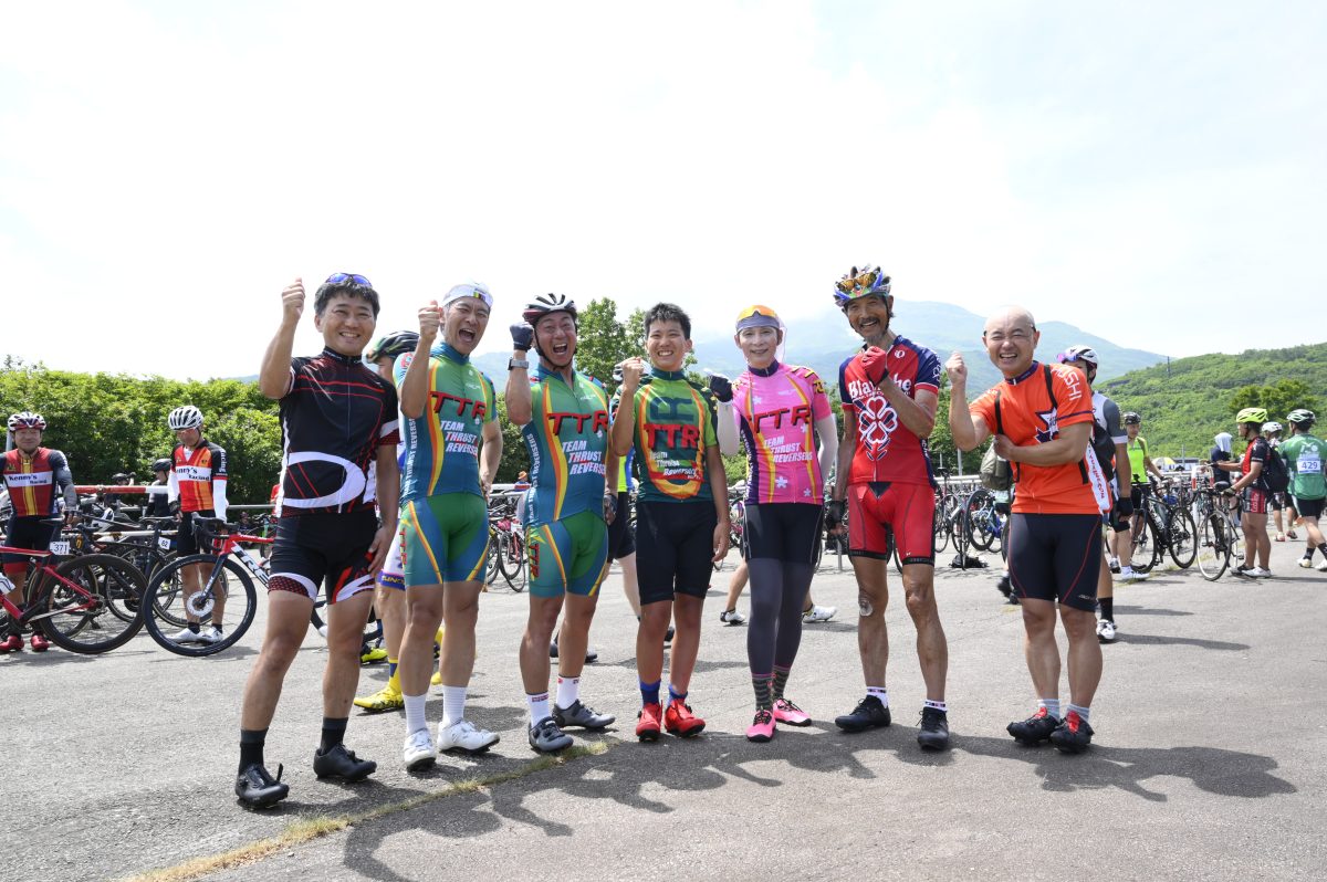 TTRというチームの皆さん。名前はチーム・スラスト・リバースの略称で、意味は逆噴射とのこと。ジェットエンジンの設計の仕事をしていたメンバーの発案で、「自虐的に、僕たちの後ろにつくと遅くなるよという意味あいで(笑)」とのことだ。ただ、小田憲司さん(左から2番目、51歳)は世代別で3位、小坂礼央さん(こさかれおん、写真中央、15歳)は世代別で2位という結果で、もはや普通に噴射なのだが……。