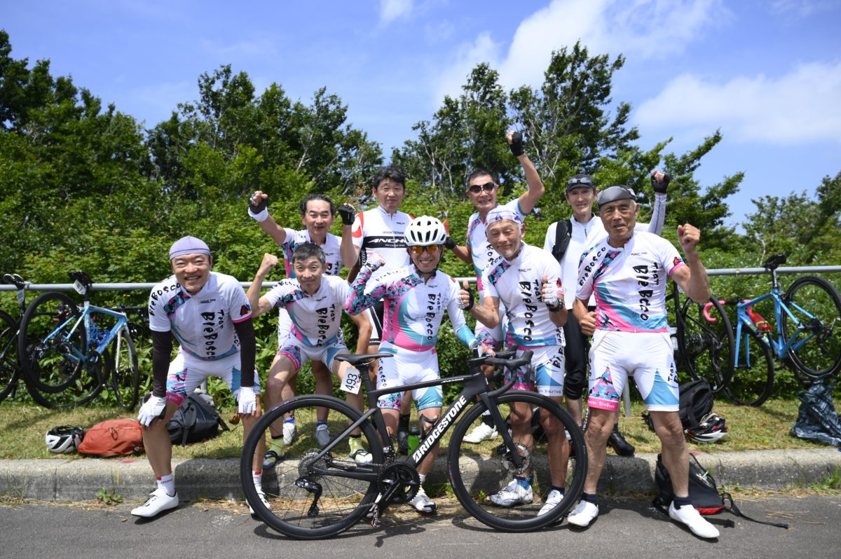 「おやじギャグです。おっさんチームです(笑)」と明るく話してくれたのが手前列中央の尾形重夫さん(59歳)。チームとしてはもう10年以上連続で参加していて、毎年のメインイベントがこの矢島カップとチャレンジヒルクライム岩木山の2つとのことだ。「地元の声援やボランティアスタッフの方がとても熱心で、参加しててとても楽しい。パレード走行だけですでに楽しくて、これは10年前から変わらない」とのことだ。また、遠方からの参加者がいても、2日間の大会だから初日の夜に一緒に食事をしたりゆっくり楽しめるとてもいい機会になるとのこと。