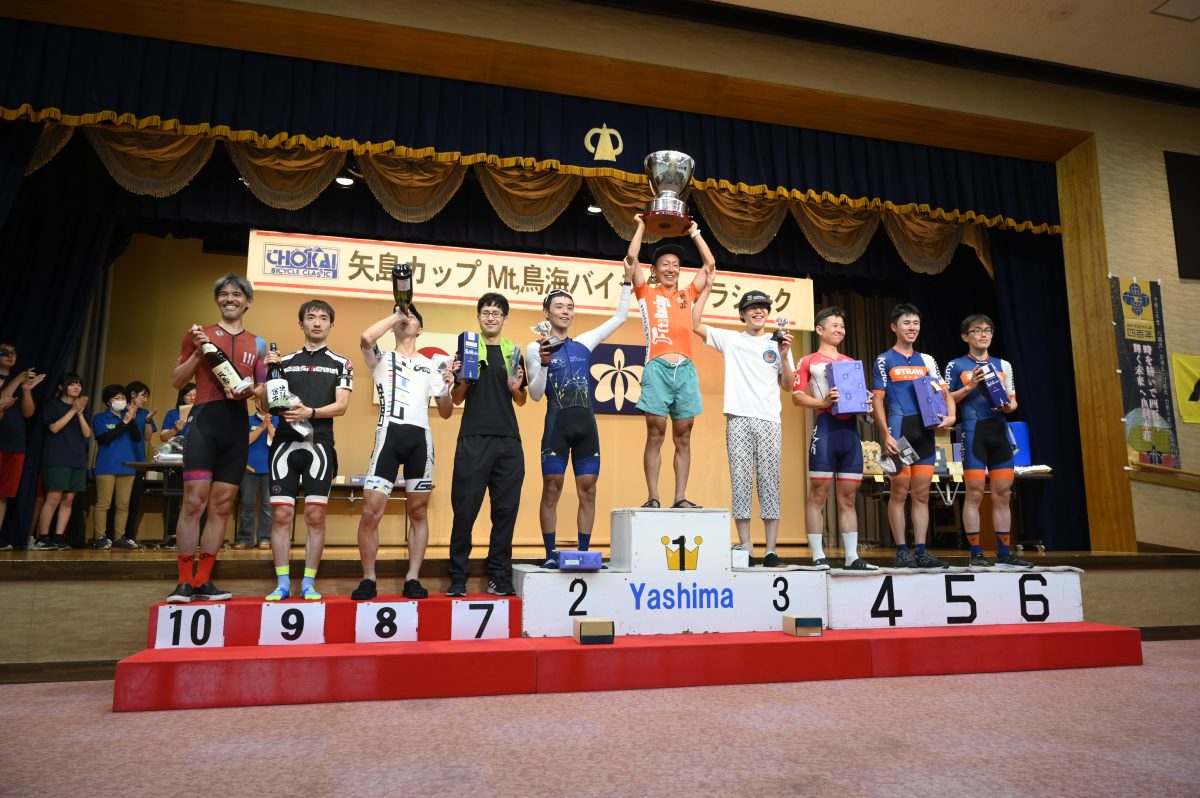 ヒルクライムの優勝者は森谷康平さん(秋田県、たぬきーず)。1時間2分59秒という好タイム。昨年のヒルクライム覇者で8年ぶりの矢島カップ奪還を狙う田崎友康さんは約14秒差で第2位という結果に。果たして総合優勝の座はどうなるか、それは下山後の表彰式で明らかになる。