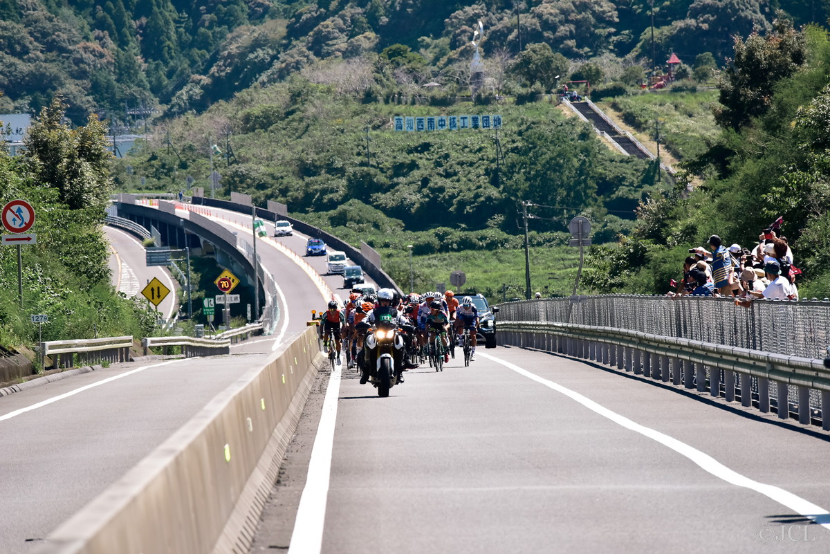 序盤からブラインドコーナーや狭いスロープの先のUターンなどを利用して選手たちはアタックを繰り返し、抜け出しのチャンスを図ります。最初に大きな動きとなったのは2周目の高速道路区間。宿毛選抜の選手のアタックを皮切りに数名の飛び出しが発生し、ひとつになります。