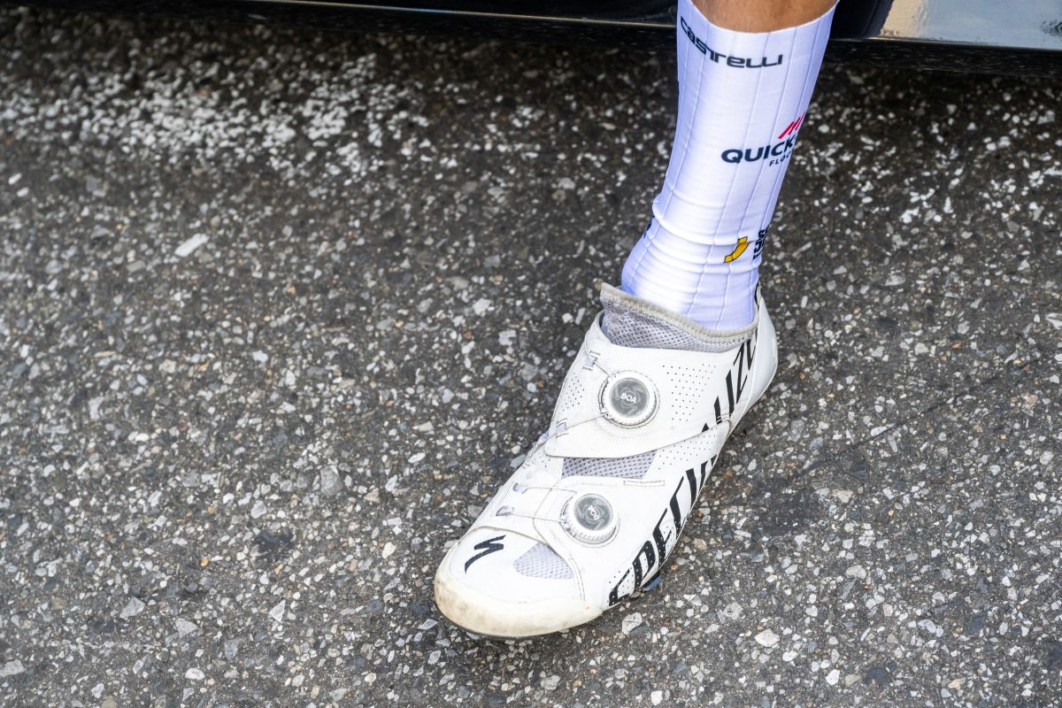 アラフィリップが履いていたシューズは、自身も開発に参加したスペシャライズド エスワークス アーレスだ。このシューズは、パワー伝達性と快適性を高次元で両立させることを目標に作られた。特徴的なクロージャーは、足にフィットしながらも、不快な圧迫感や痛みを和らげる。ボディジオメトリーデザインは、足やヒザ、股関節のアライメントを整えることで、パワーと快適性を向上させるとともに、ケガの予防にも役立つ。また、世界最高レベルの剛性を持ったカーボンアウトソールは、ペダルへの力をそのまま加速力に変える。科学的な実験によって、スペシャライズドが今まで作ったシューズの中で最も速いことが証明されている。