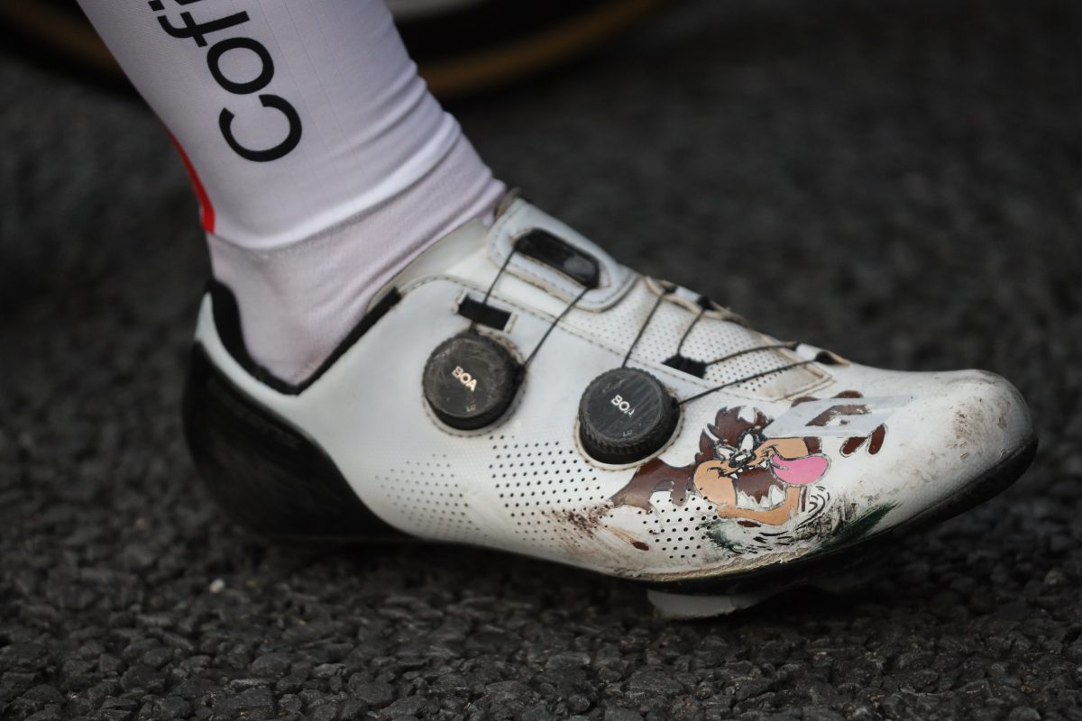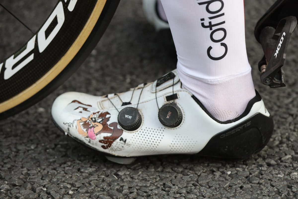 ジングレは、タズマニアン・デビルの絵が書かれたガエルネ G.エスティエルを履いていた。このシューズは、カーボンソールと軽量で通気性の高いアッパーで作られている。カーボンソールは剛性指数12で、ペダルへの力を効率的に伝える。足裏のアーチに合わせた形状で、足の安定性も確保する。ソールには4つの空気口があり、アッパーはレーザーで穴をあけたマイクロファイバーで、通気性も抜群だ。