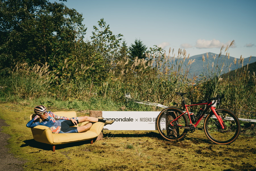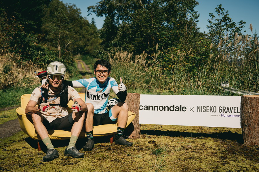 これが話題のカウチソファ。アメリカのグラベルレースなども経験しているキャノンデールジャパンスタッフが、本場の空気を伝えようとこの文化を持ち込んだ。一緒に写っているYoh Yamadaは私の小中学校の同級生で、メキシコでグラベルレースを主催しており、ニセコグラベルを楽しむために来日した