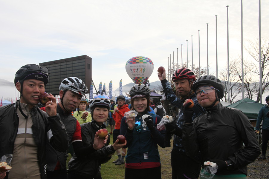 メインライド当日。7時からスタートだが、その前に朝食が配られるのでそれに合わせて6時過ぎくらいから徐々に参加者が集まり始める。朝食として配られた地元の食材を使ったおにぎりがおいしい。
