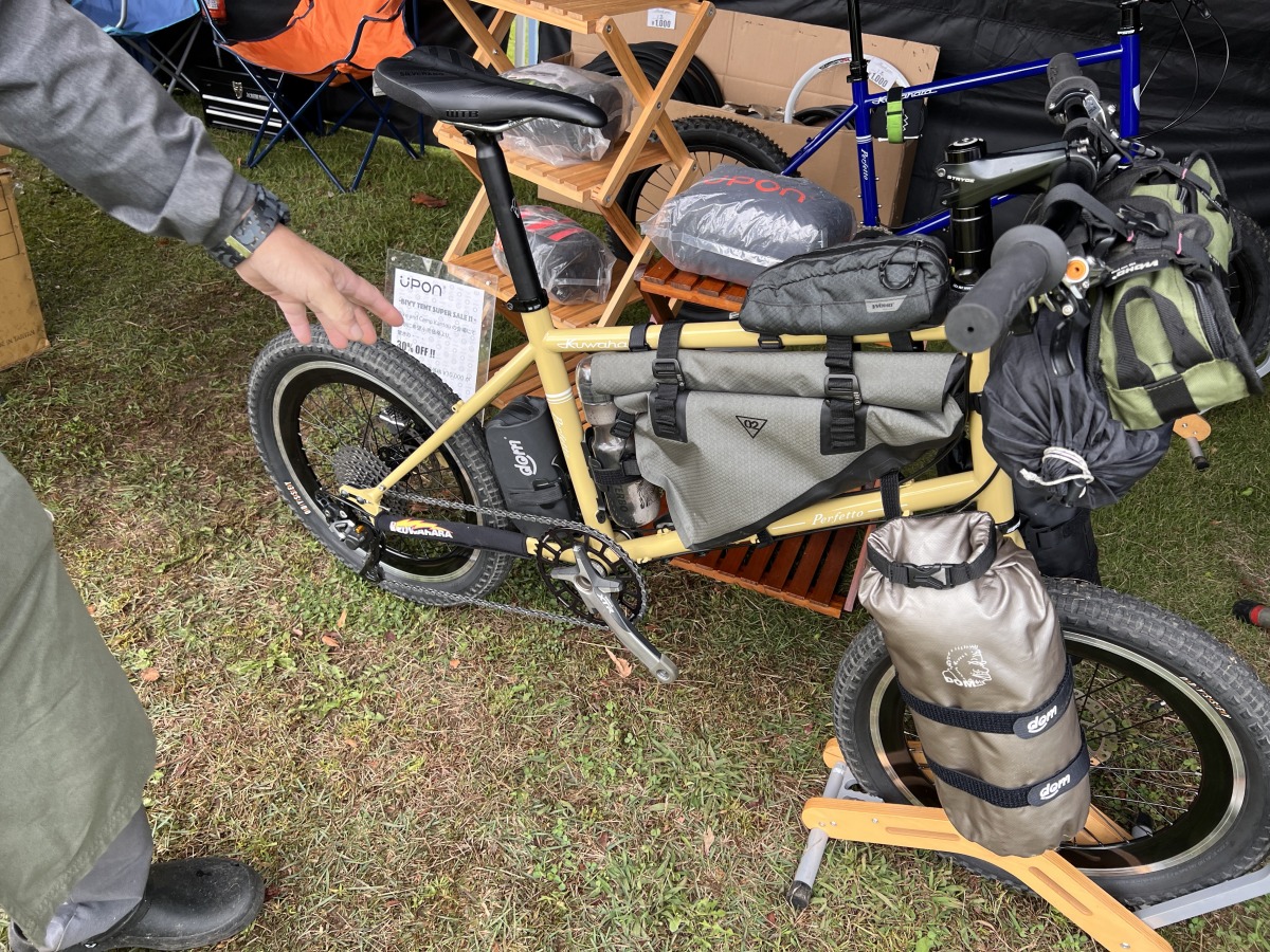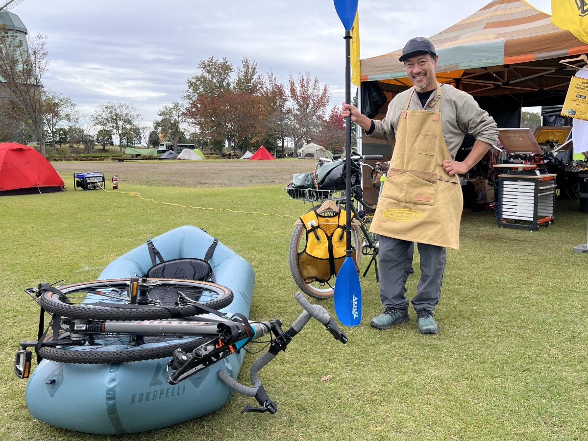 グラベルバイクとパックラフトを組み合わせた「バイク・ラフト」というネーミングで新しい遊び方を追求し、自らの私物を展示してくれた稲葉さん。