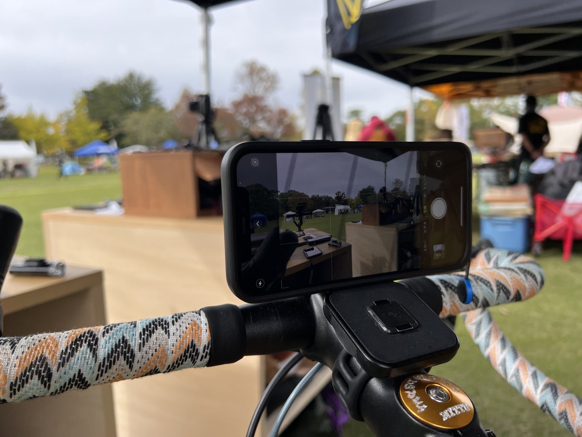 ハンドルバーへの固定は工具いらずで手で回せる。このようにマウントそのものを90度回転させてスマホスタンドに早変わりという小技を教えてくれた。