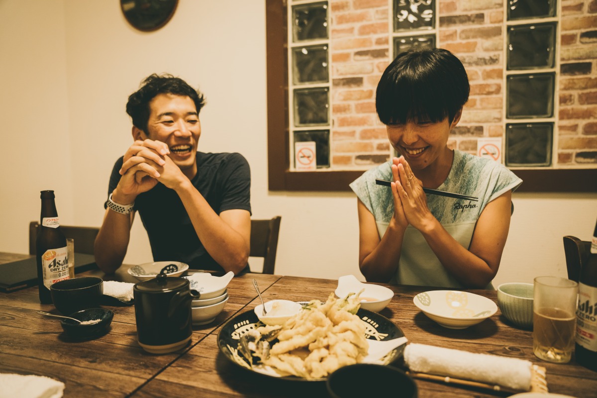 ライドを終えて、お待ちかねの夕食タイム。地元の魚料理店にお願いして、豆アジとキスを天ぷらにしてもらった。木下さんにとっては念願の「釣った魚を食べる」瞬間。さっくりほろほろ、な釣りたてキスの天ぷらをおいしそうに頬張ってご満悦。走って釣った一日の完璧な締めくくりである。「いつも自転車で通り過ぎるスポットで釣りができるなんて意外でした。これからは自転車で走りながら周囲を見る目が変わりそうです(笑) まさか本当に釣った魚を食べることができるなんて思っていなかったので、感動しました」。