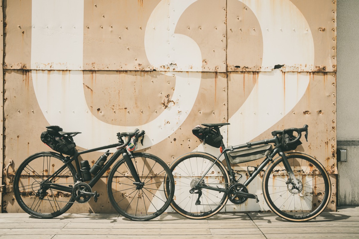 左は木下さんの愛車コルナゴC-RS。フロントバッグと大型サドルバッグのセットアップ。右は小俣のスペシャライズド、エートス。前後ラファ×アピデュラのバッグとフレームバッグで釣り道具一式を運ぶ。先日取材したパリ〜ブレスト〜パリで参加者の多くがアピデュラのバッグを使っているのを見て感化されてのチョイスだ。