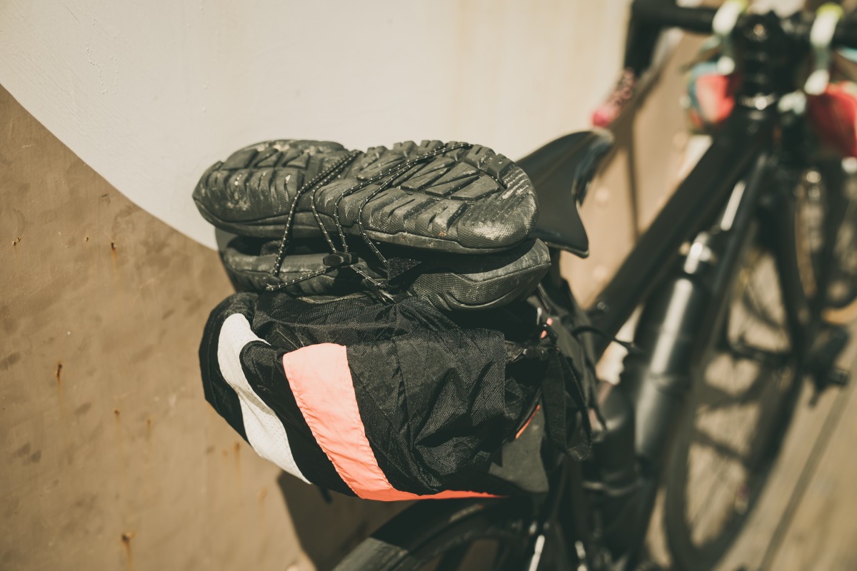 さらにたまたまふたりともラファ×アピデュラのサドルバッグを使用。大型で容量が多いのが魅力だが、バンジーコードがついているのも使い勝手がいい。木下さんは釣りをするときのサンダルをここに挟み込み、カラビナで落下防止して運ぶ。